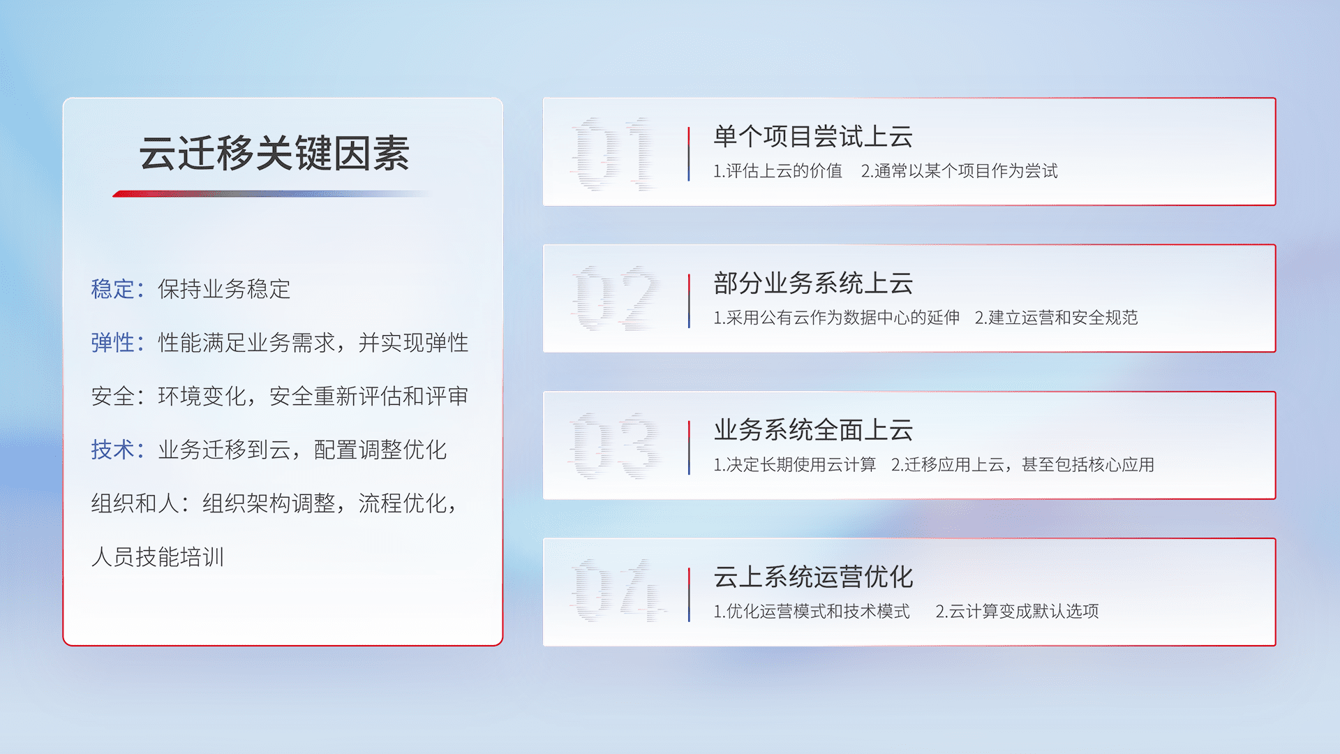 结合实际业务,,,,从规划设计、、云平台选型、、、云原生改造、、、、数据迁移、、、集成交付,,,迁移全过程为客户识别最佳上云路径,,,做好风险识别管理,,,设计网络架构、、、身份权限、、、安全审计合规、、、操作审计、、日志审计、、、、监控告警策略、、、多站点容灾设计等,,,,对云上基础设施进行整体规划,,,提升IT治理水平,,以满足弹性、、、高可用、、高性能的需求。。