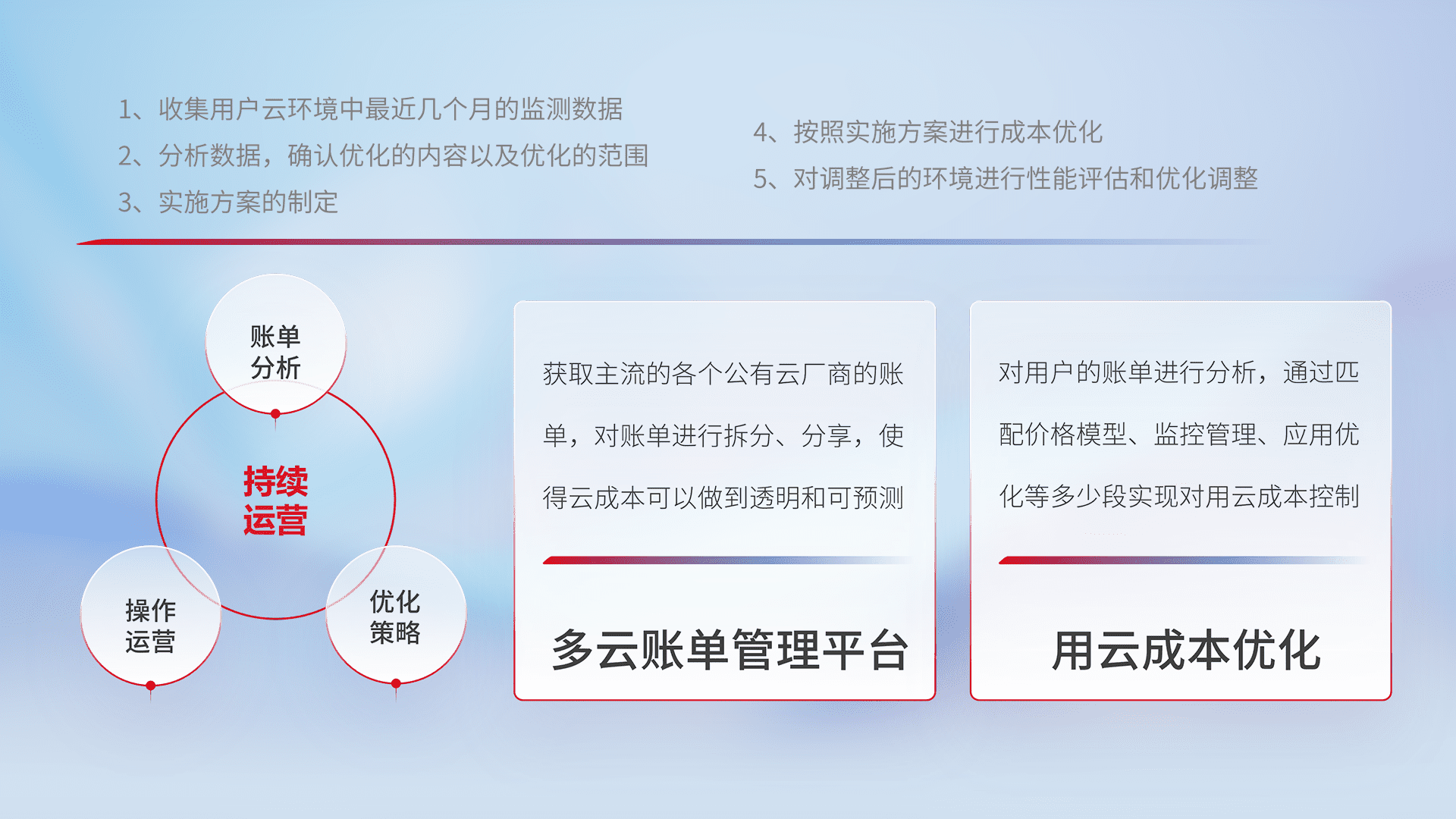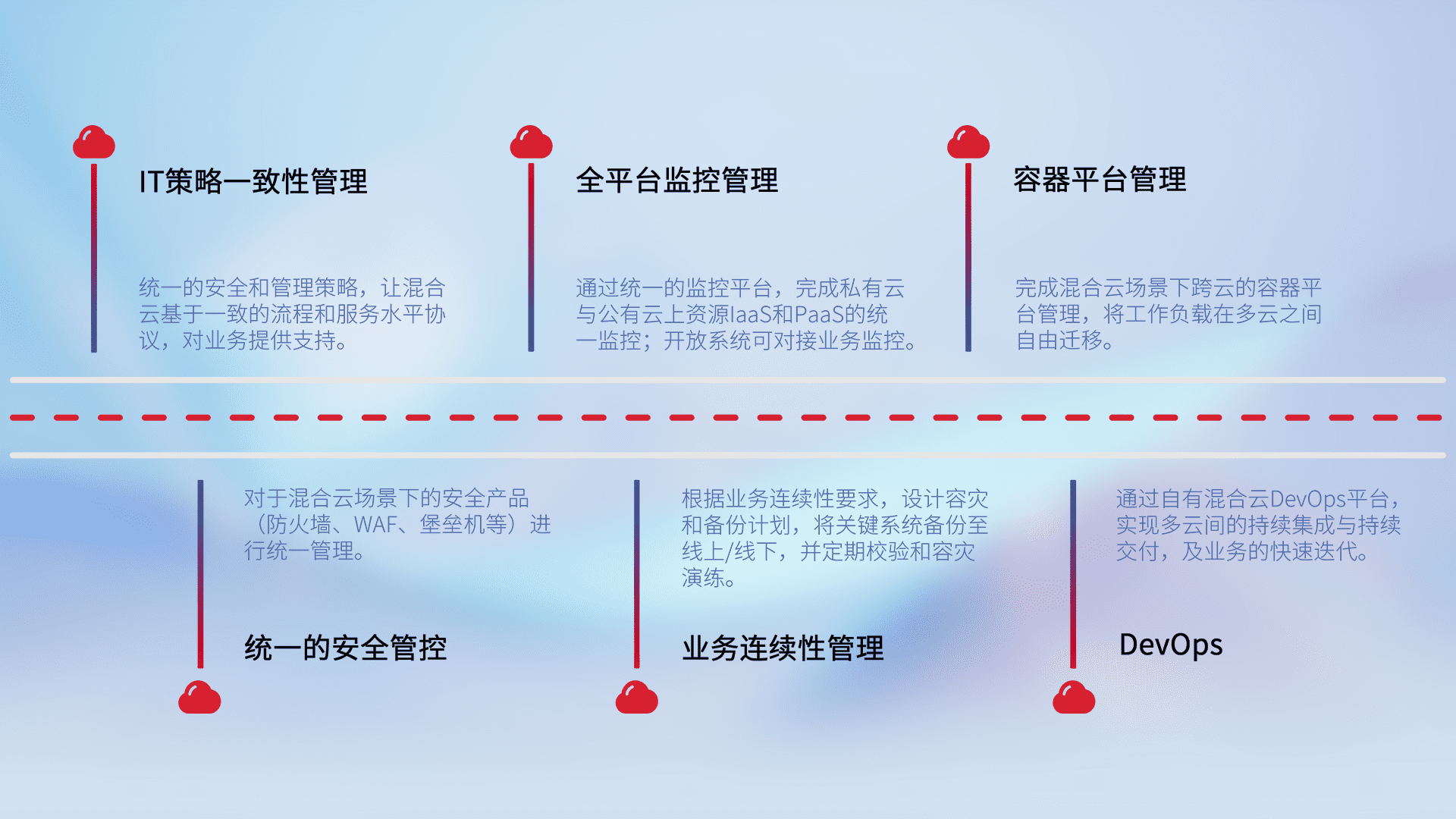 通过多云纳管,,,,以统一的资源数据模型把客户的云资源进行抽象和封装,,进而实现对多云资源的统一操作,,,,保障云资源管理的可靠性、、、稳定性与可用性。。。量身定制化运维内容,,,配置、、、、开发运维、、补丁管理、、、备份、、、、监控、、、、认证和访问管理、、、审计和日常巡检等,,,保障在用云过程中的可靠度,,,,稳定度以及高可用率。。。