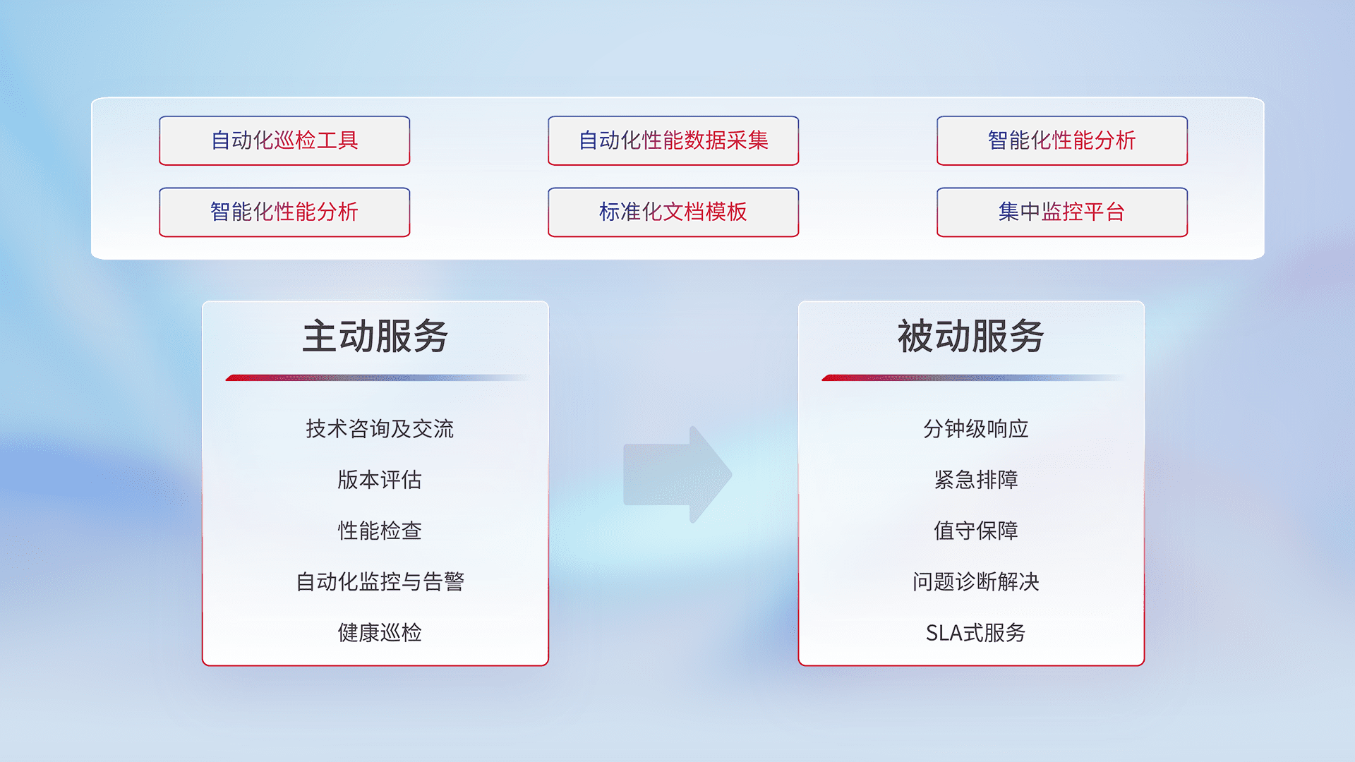 智能化工具和标准化文档,,,,保障服务质量,,,,提供主动服务(包含技术咨询、、、、版本评估、、、、性能检查、、自动化监控与告警、、、健康巡检)和被动服务包含(分钟级响应、、、、紧急排障、、、、值守保障、、问题诊断解决、、、SLA服务)。。。